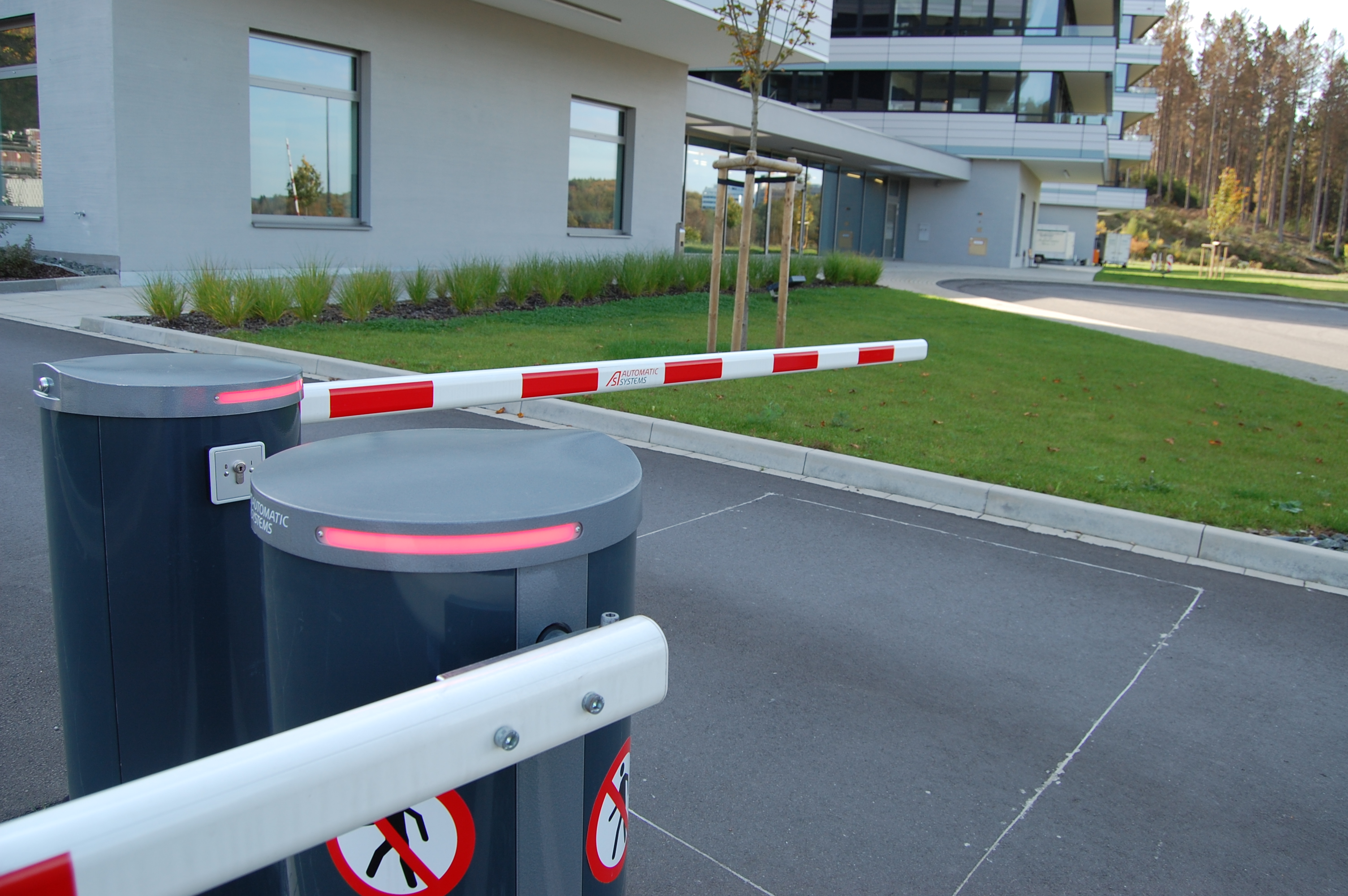 Damit die Parkplätze nicht durch Fremdparker belegt werden, entschieden sich die Verantwortlichen dazu, die Ein- und Ausfahrt mit Schranken abzusichern. „In erster Linie soll durch die Schranken verhindert werden, dass unberechtigte Personen hier parken. In unserer Nähe befindet sich ein Fußballstadion und die Fans nutzen gerne die Parkplätze von den benachbarten Firmen. Zum anderen dienen die Schranken als Sicherheit für nachts oder an Wochenenden“, erklärt Tristan Neuhaus, Manager Digital Marketing, Marketing und Corporate Strategy bei der pmdtechnologies ag, einem Unternehmen in The SUMMIT. Für die Geländeabsicherung beauftragte der mit dem Neubau vertraute Generalunternehmer sein langjähriges Partnerunternehmen, die Bochumer Drahtwaren- und Gitterfabrik Fritz Buhr GmbH & Co. KG. Letztere arbeitet in diesen Bereich wiederrum seit vielen Jahren mit Automatic Systems zusammen, die die beiden zum Einsatz kommenden Schranken BL15 lieferten. „Im Durchschnitt sind 250 Mitarbeitende vor Ort, hinzukommen Lieferanten und Besucher. Die BL15 ist exakt für solch eine hohe Frequentierung geeignet und überzeugt mit einer Öffnungs- und Schließgeschwindigkeit von lediglich 1,2 Sekunden“, erklärt Carmen Unger, Vertrieb und Bauleitung bei der Bochumer Drahtwaren- und Gitterfabrik Fritz Buhr GmbH & Co. KG und Ansprechpartnerin des Projekts. Trotz der hohen Geschwindigkeit führt der ovale Schrankenarm die Bewegung perfekt aus und verhindert lange Wartezeiten. „Sogar Fahrradfahrer können die Schranke passieren, da die Induktionsschleife im Boden Metall erkennt und somit auch in diesem Fall öffnet“, führt Unger weiter aus und Neuhaus ergänzt, dass es den Verantwortlichen dennoch wichtig war, einen gewissen Abstand zwischen Schranke und Begrünung einzuhalten, da sich an dem alten Standort ein Kollege beim Vorbeifahren an einer Schranke schwer verletzt hatte. Für das Öffnen der Schranke zeigen die Mitarbeitenden bei der Einfahrt ihre Berechtigungskarte vor, die gleichzeitig im Gebäude zum Öffnen von Türen eingesetzt wird. Besucher werden über ein Klingelmodul mit dem Empfang verbunden, der anschließend die Schranke öffnet. Die Ausfahrt ist frei. „Eine automatische Kennzeichenerkennung kam für uns nicht in Frage, da wir oft Mietfahrzeuge und Poolfahrzeuge nutzen“, erklärt Neuhaus die Entscheidung.