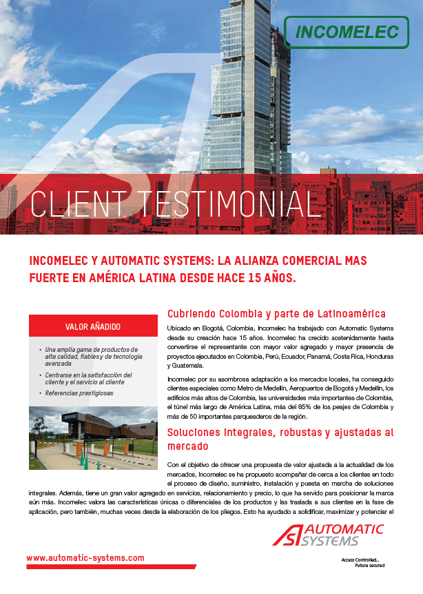Ubicado en Bogotá, Colombia, Incomelec ha trabajado con Automatic Systems desde su creación hace 15 años. Incomelec ha crecido sostenidamente hasta convertirse el representante con mayor valor agregado y mayor presencia de proyectos ejecutados en Colombia, Perú, Ecuador, Panamá, Costa Rica, Honduras y Guatemala.