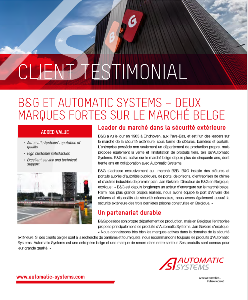 B&G a vu le jour en 1963 à Eindhoven, aux Pays-Bas, et est l’un des leaders sur le marché de la sécurité extérieure, sous forme de clôtures, barrières et portails. L’entreprise possède non seulement un département de production propre, mais propose également la vente et l’installation de produits tiers, tels qu’Automatic Systems. B&G est active sur le marché belge depuis plus de cinquante ans, dont trente ans en collaboration avec Automatic Systems.