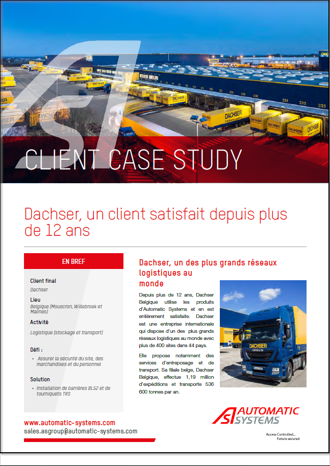 Dachser Belgique est très satisfait des produits d’Automatic Systems et, tout particulièrement, de son service de maintenance. Dachser est également fournisseur de longue date d’Automatic Systems pour le transport routier de ses produits en Europe. Tom Verheyen, Managing Director de Dachser Mouscron : « Nous sommes très satisfaits de cette collaboration fournisseur/client qui fonctionne très bien depuis des années. Elle est basée sur un grand respect mutuel et une communication transparente. » Les produits d’Automatic Systems sont parfaitement adaptés au secteur logistique. Les barrières périmétriques BL52 et les tourniquets TRS d’Automatic Systems ont permis à Dachser de sécuriser de manière optimale leur site étendu, les marchandises stockées et les collaborateurs qui y travaillent. Les barrières BL52 sécurisent une ouverture jusqu’à 6,5 m de long et s’ouvrent en hauteur, ce qui permet de réduire l’espace à sécuriser en comparaison avec les barrières coulissantes. Leur ouverture automatique permet un passage plus rapide et est adaptée à un usage intensif. Grâce à l’utilisation des produits d’Automatic Systems, Dachser a constaté une amélioration de la productivité et un gain de temps sur son site qui doit absorber le passage d’une centaine de camions quotidiennement.