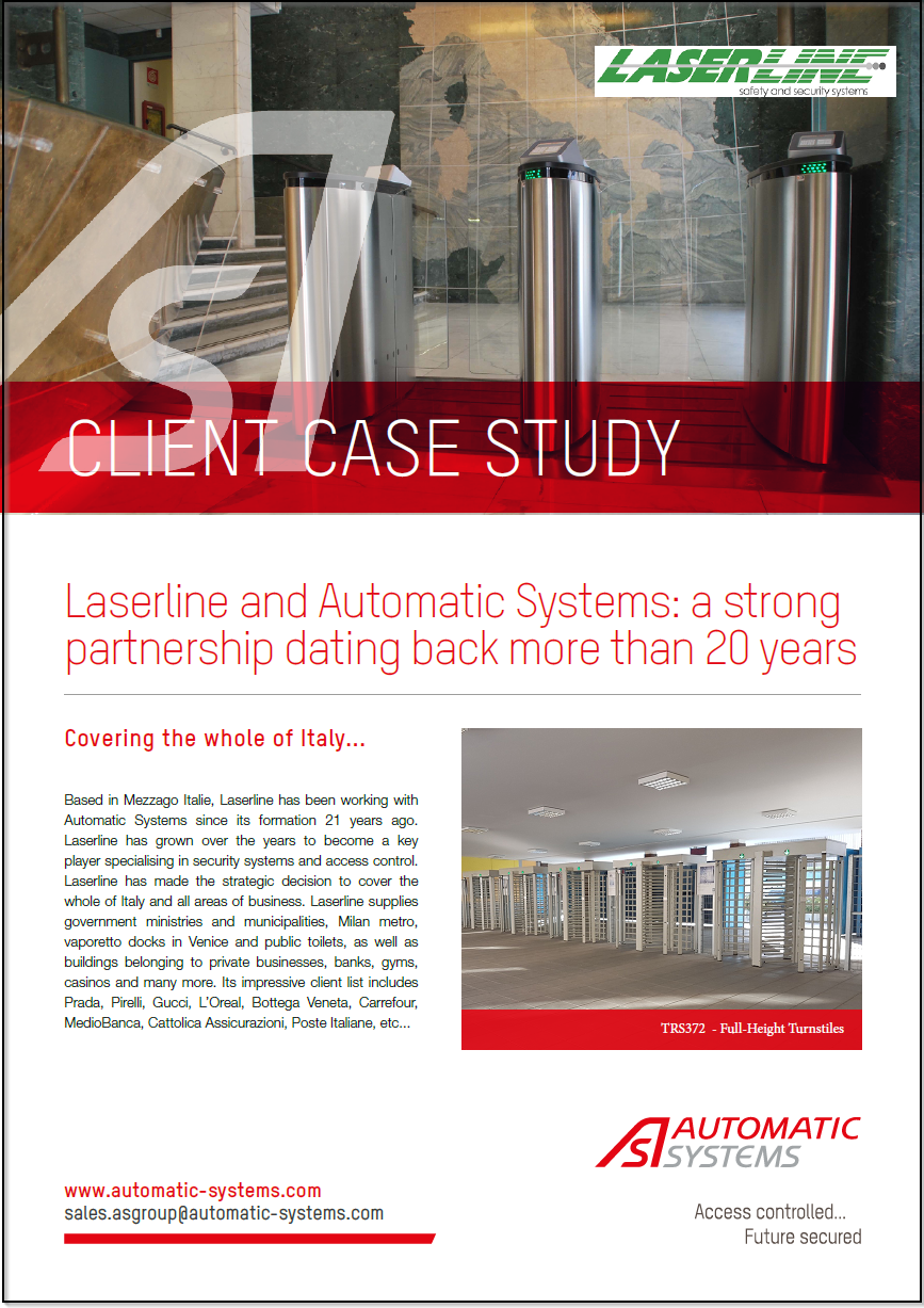 Based in Mezzago Italie, Laserline has been working with Automatic Systems since its formation 21 years ago. Laserline has grown over the years to become a key player specialising in security systems and access control. Laserline has made the strategic decision to cover the whole of Italy and all areas of business. Laserline supplies government ministries and municipalities, Milan metro, vaporetto docks in Venice and public toilets, as well as buildings belonging to private businesses, banks, gyms, casinos and many more. Its impressive client list includes Prada, Pirelli, Gucci, L’Oreal, Bottega Veneta, Carrefour, MedioBanca, Cattolica Assicurazioni, Poste Italiane, etc…