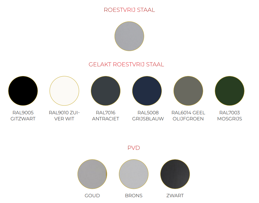 We bieden een ruime keuze aan kleuren en afwerkingen: